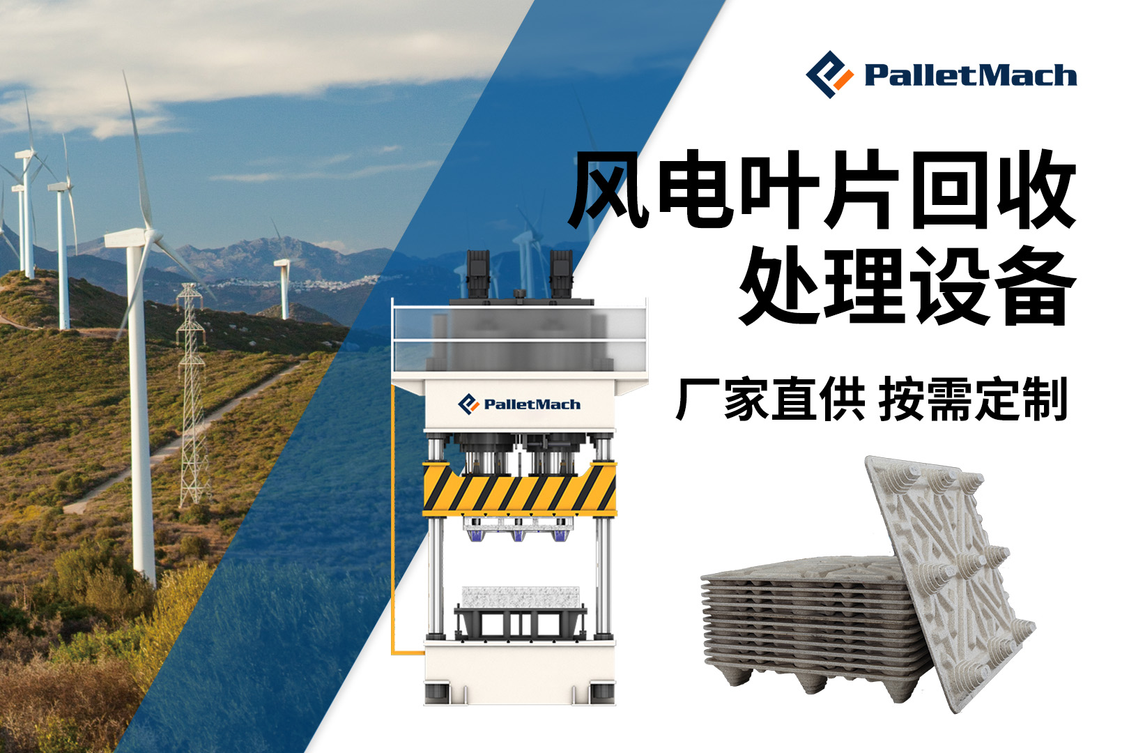 派莫机械推出的废风电叶片模压托盘设备,可将粉碎后的风电叶片加工制成物流托盘,解决风电叶片处理难题,为客户提供废风电叶片处理解决方案。